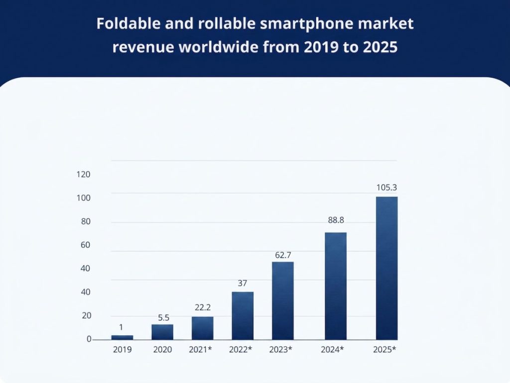 According to Statista, the global foldable and rollable smartphone market revenue saw an increase of 4.5 billion US dollars in 2020 alone. More strikingly, the market is expected to develop at a CAGR of more than 80% to reach over 105 billion US dollars between 2020 and 2026.